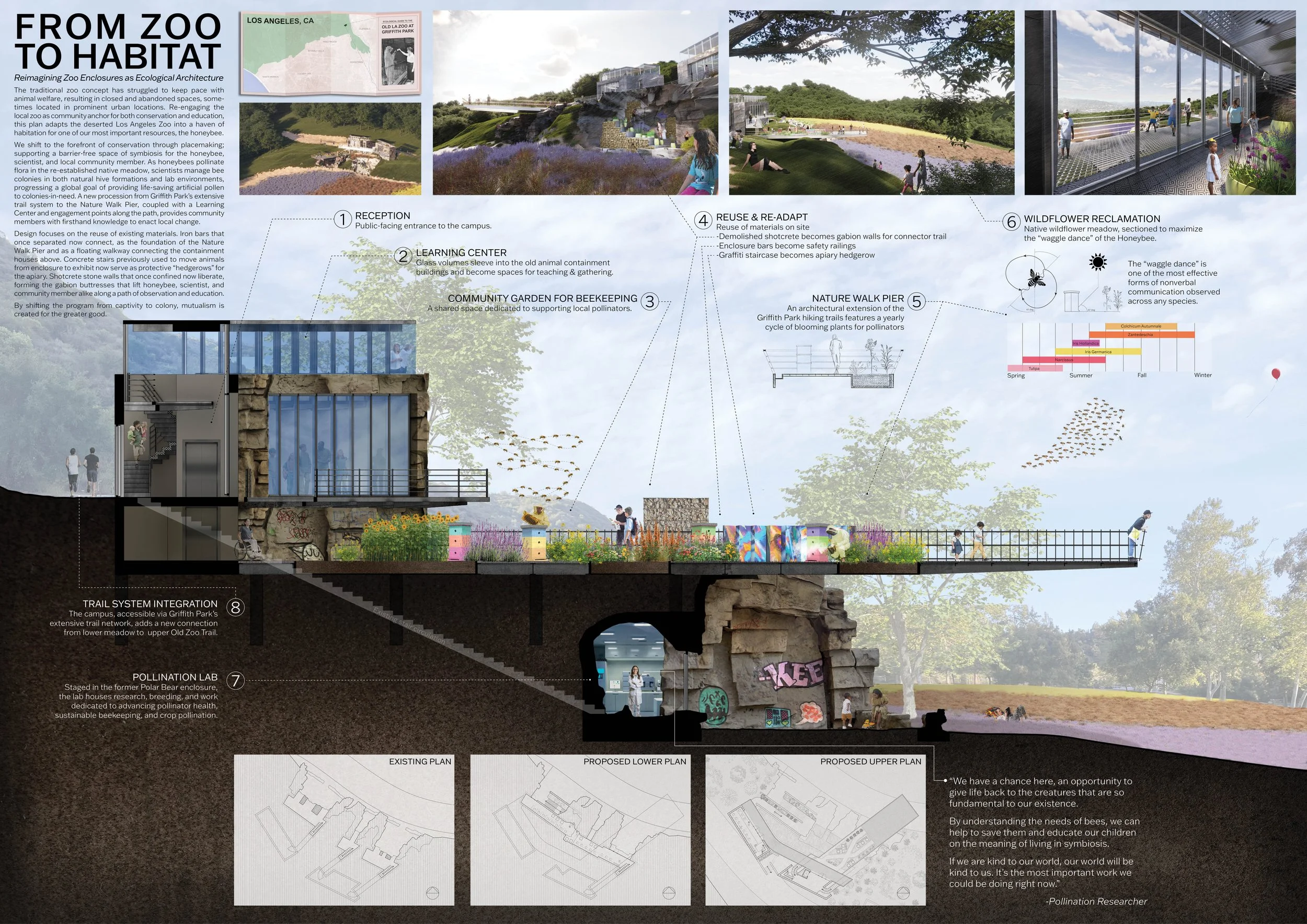 The traditional zoo concept has struggled to keep pace with animal welfare, resulting in closed and abandoned spaces, sometimes located in prominent urban locations. Re-engaging the local zoo as community anchor for both conservation and education, this plan adapts the deserted Los Angeles Zoo into a haven of habitation for one of our most important resources, the honeybee.