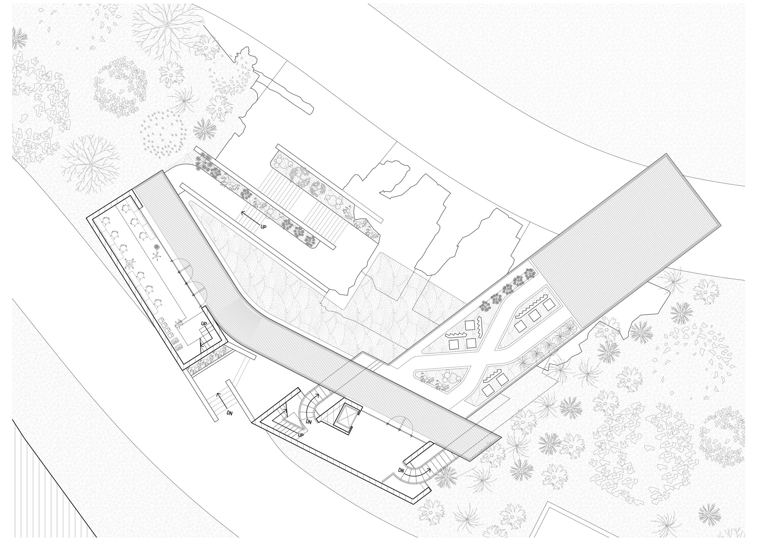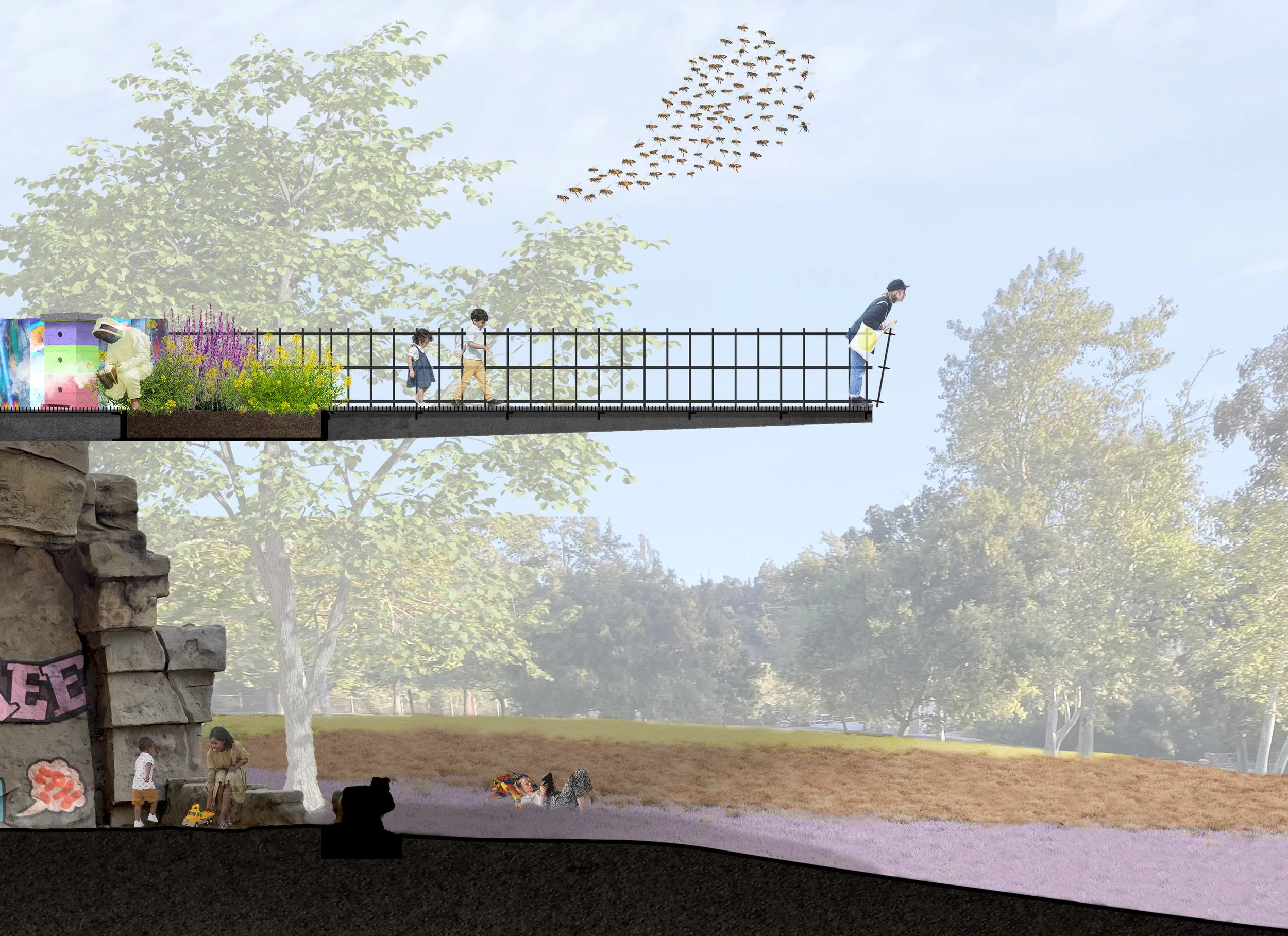 We shift to the forefront of conservation through placemaking; supporting a barrier-free space of symbiosis for the honeybee, scientist, and local community member. As honeybees pollinate flora in the re-established native meadow, scientists manage bee colonies in both natural hive formations and lab environments, progressing a global goal of providing life-saving artificial pollen to colonies-in-need. A new procession from Griffith Park’s extensive trail system to the Nature Walk Pier, coupled with a Learning Center and engagement points along the path, provides community members with firsthand knowledge to enact local change.